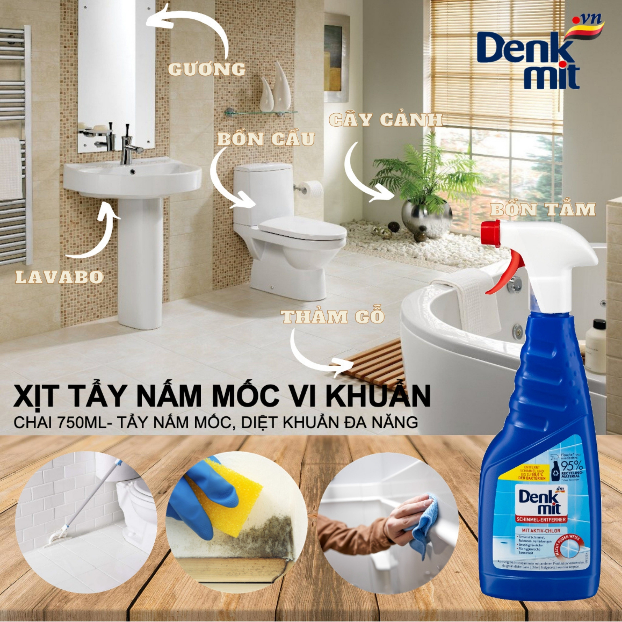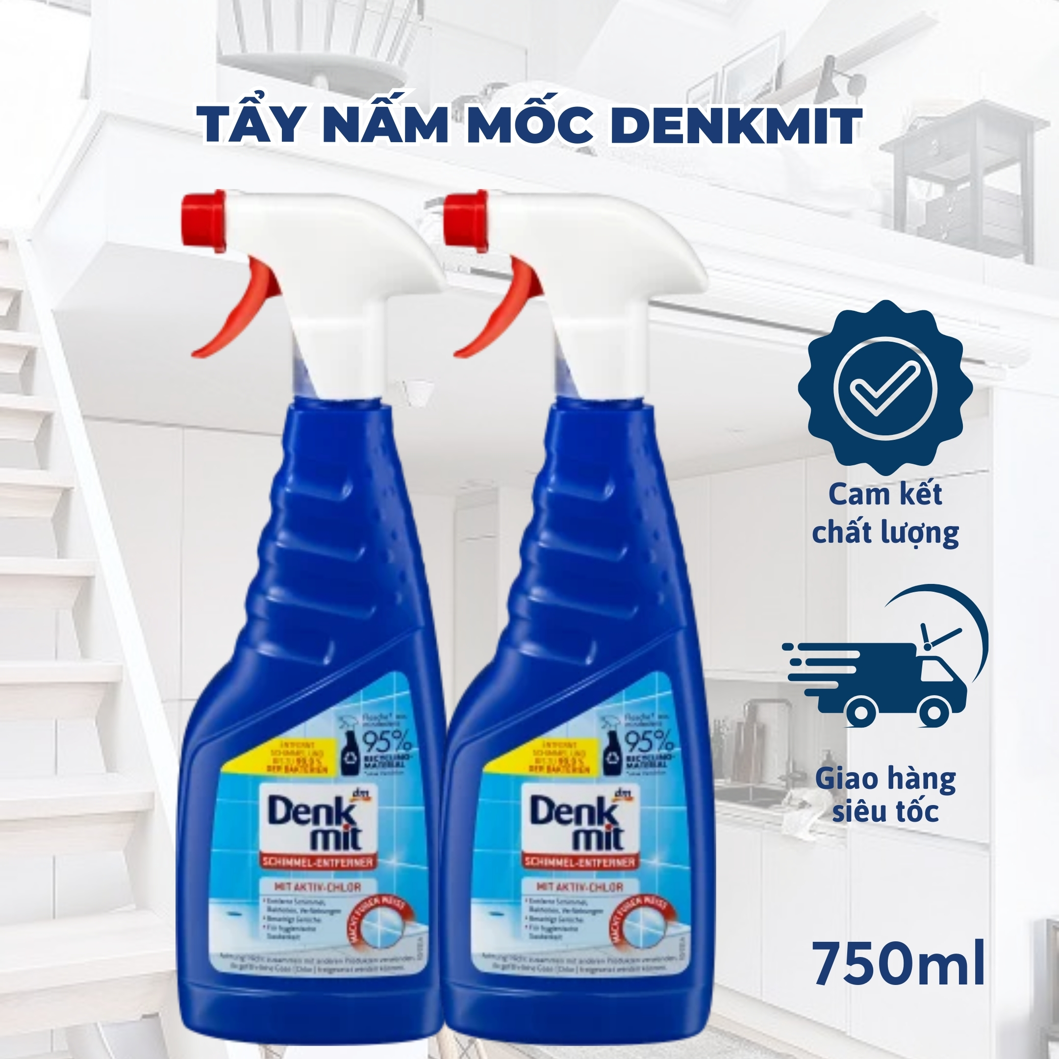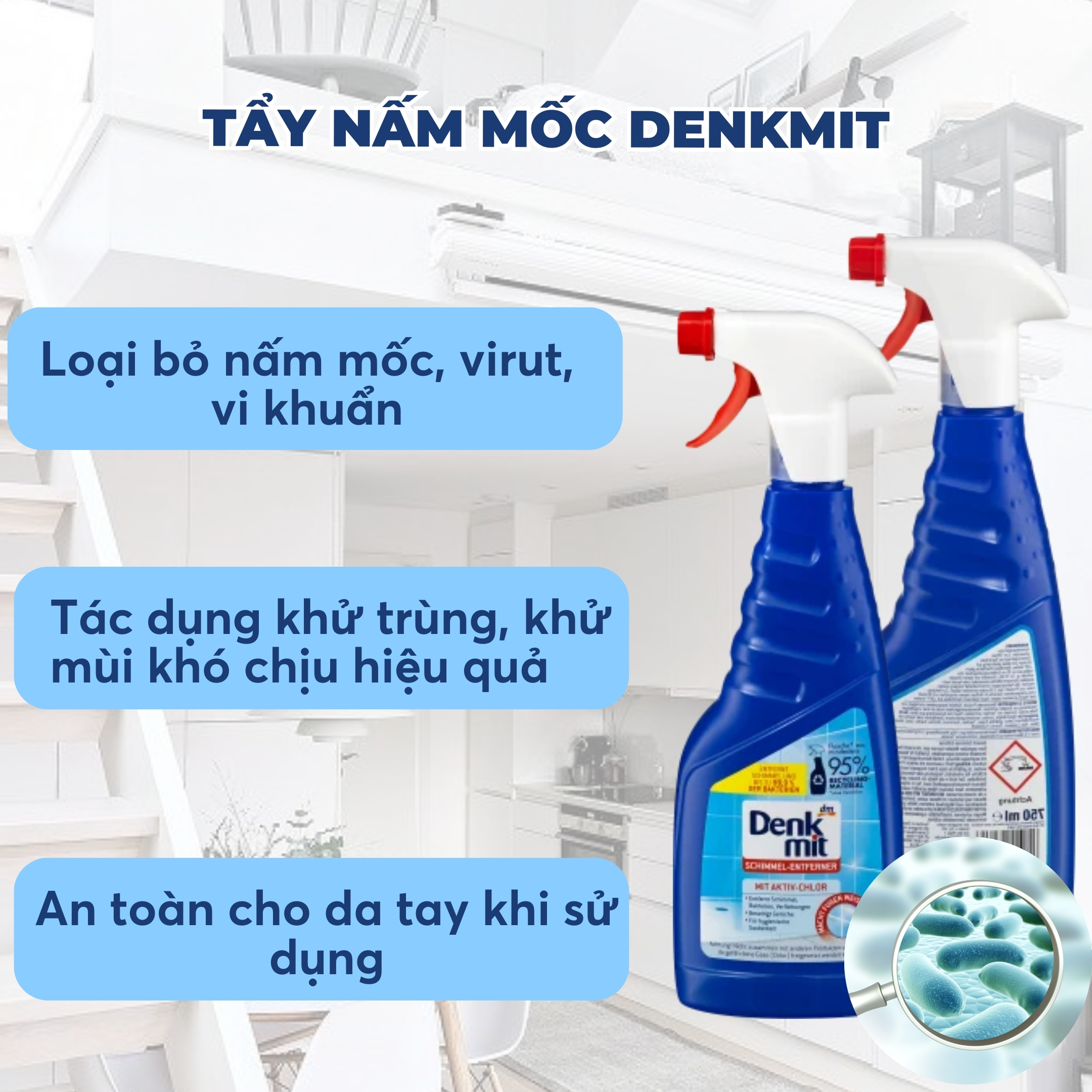 - Chai xịt tẩy vi khuẩn nấm mốc đa năng Denkmit giúp tẩy sạch và ngăn ngừa sự phát triển của nấm mốc vi khuẩn gây hại, trả lại không gian sống bầu không khí trong lành sạch sẽ.