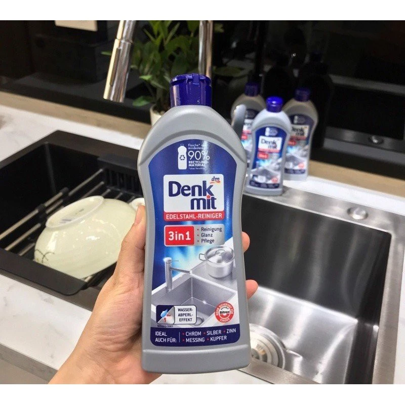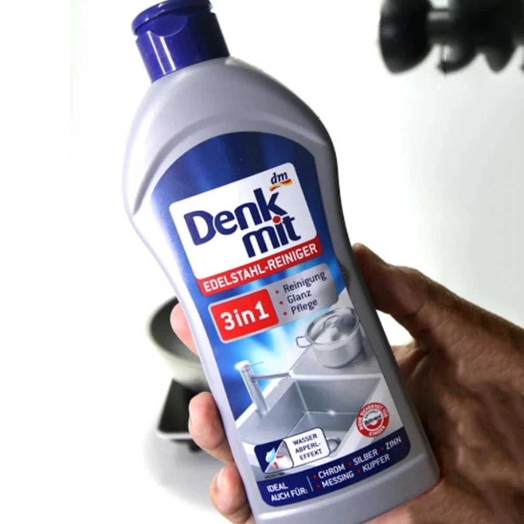 - Chất tẩy rửa thép không gỉ của Denkmit làm sạch tất cả các bề mặt được làm bằng gốm và thép không gỉ sáng bóng hoặc có độ bóng cao cũng như các đồ vật bằng thiếc, đồng thau, crom, bạc và đồng một cách đáng tin cậy và nhẹ nhàng. Vết dầu mỡ và nước, ví dụ như trên bồn rửa, phụ kiện, chậu và dao kéo, được loại bỏ dễ dàng.