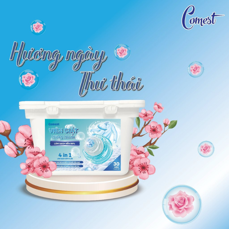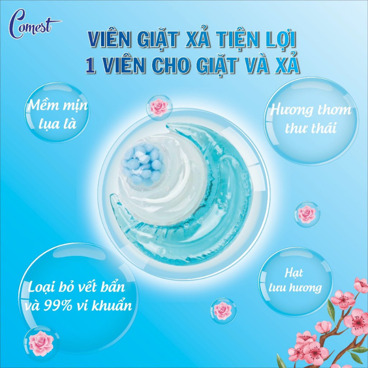 - Comest là sản phẩm tiên phong trong công nghệ kết hợp hài hòa 2 sức mạnh Giặt & Xả trong 1 viên giặt xả tiện lợi, với quy trình sử dụng đơn giản, nhanh gọn chỉ trong 1 bước, 1 giây mà không cần phải đong đo lượng sản phẩm, mang lại hiệu quả tối đa chỉ trong 1 bước.