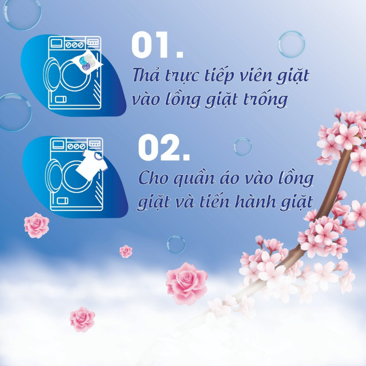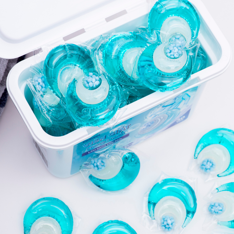 (Không cần xóa bỏ lớp màng ngoài của viên giặt. Lớp màng này sẽ tự tan trong quá trình giặt)