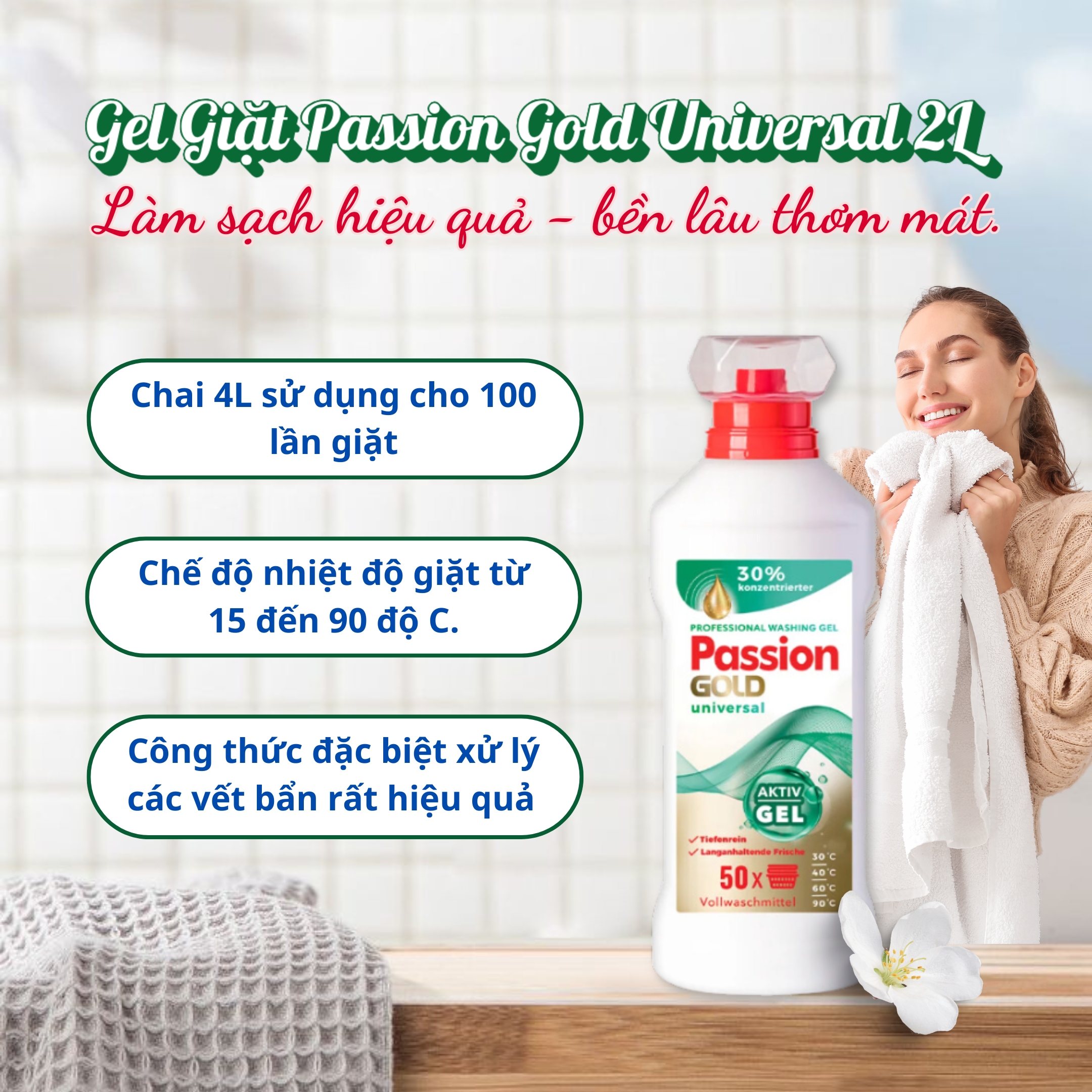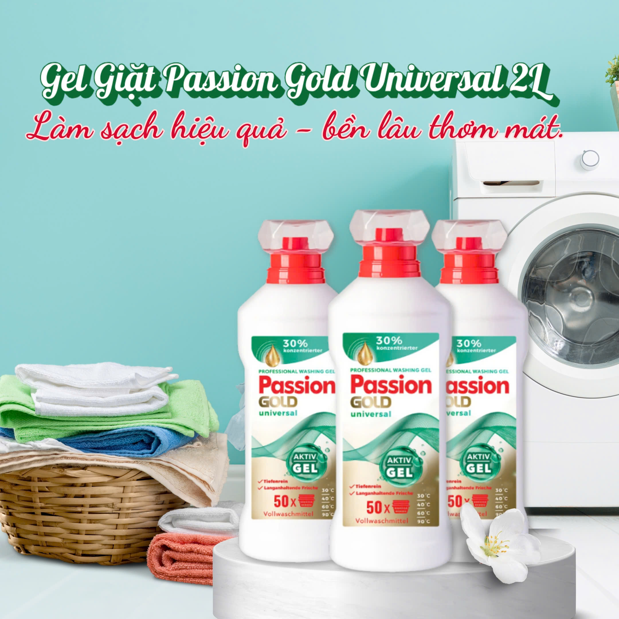 - Thành phần của nước giặt quần áo Passion Gold Universal có chứa các enzyme giúp hỗ trợ và tăng cường khả năng giặt tẩy một cách nhanh chóng. Sản phẩm có thể dùng cho tất cả các loại quần áo cũng như thích hợp với tất cả các loại máy giặt, kể cả giặt tay. Nhiệt độ giặt thích hợp nhất là từ 30°C đến 90°C.