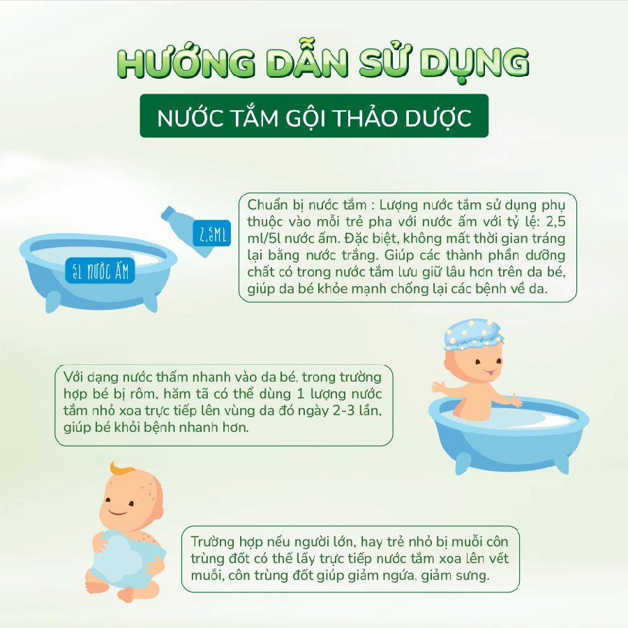 Chuẩn bị nước tắm : Lượng nước tắm sử dụng phụ thuộc vào mỗi trẻ pha với nước ấm với tỷ lệ: 2,5 ml/5 lít nước ấm. Đặc biệt, không mất thời gian tráng lại bằng nước trắng. Giúp các thành phần dưỡng chất có trong nước tắm lưu giữ lâu hơn trên da bé, giúp da bé khỏe mạnh chống lại các bệnh về da.