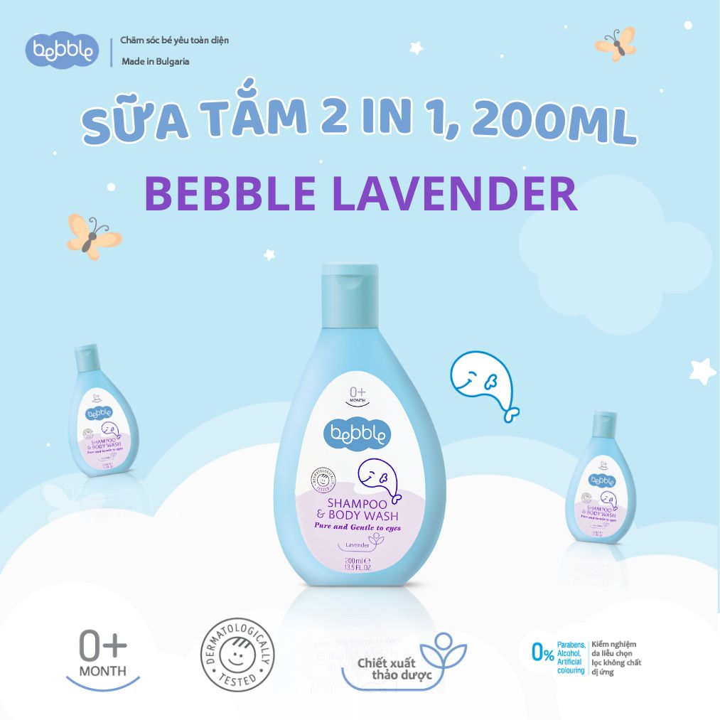 Sữa tắm gội Bebble 200ml với chiết xuất oải hương Lavender dịu nhẹ, dễ dàng làm sạch làn da bé nhưng đồng thời tạo độ ẩm lý tưởng, mang tới làn da mềm mịn, thơm mát cho bé yêu mỗi khi sử dụng. Với công dụng kép trong cùng một sản phẩm, sữa tắm gội là sản phẩm mẹ có thể sử dụng để vừa tắm, vừa gội cho bé vô cùng tiện dụng. Sản phẩm không gây cay mắt, dễ dàng tạo bọt, đồng thời không chứa paraben hay các hoạt chất có hại khác, đặc biệt an toàn cho làn da trẻ sơ sinh.